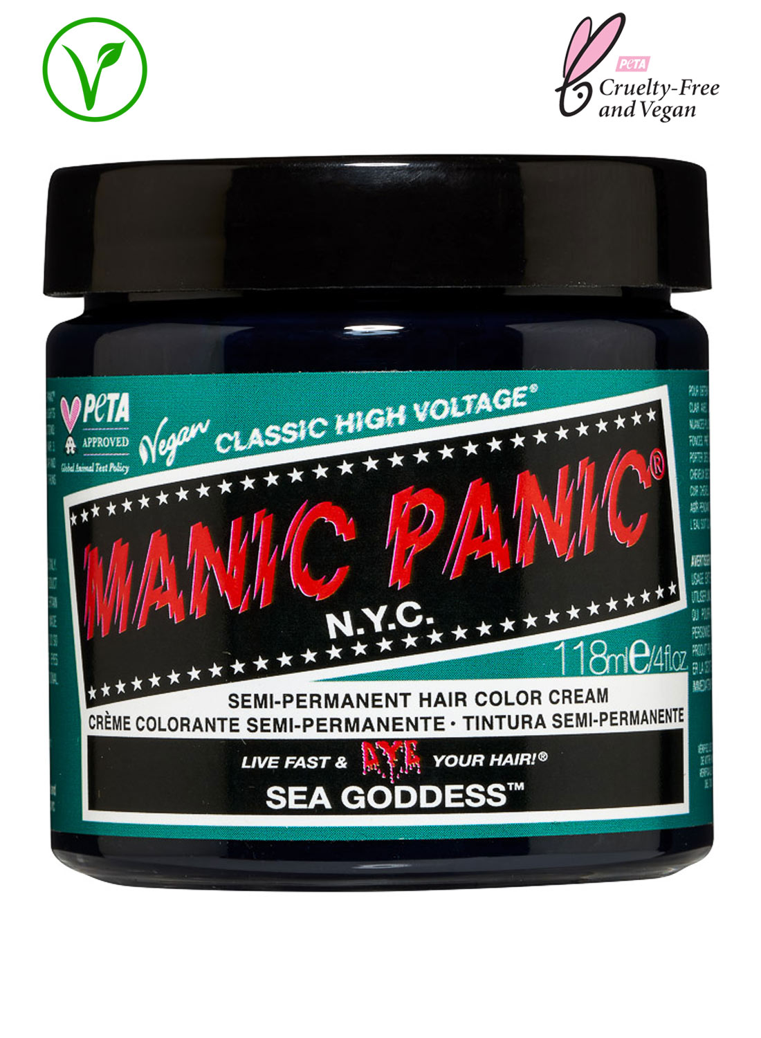 Manic Panics Classic Sea Goodess er en semi-permanent hårtoning, som giver en grøn hårfarve.