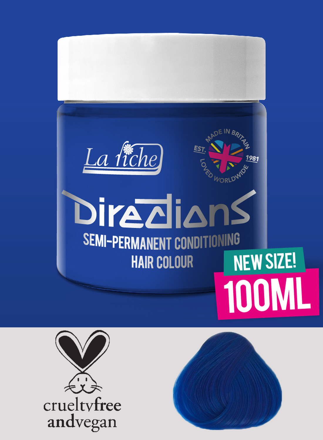 Directions Atlantic Blue er en semi-permanent hårtoning, som giver en blå hårfarve.