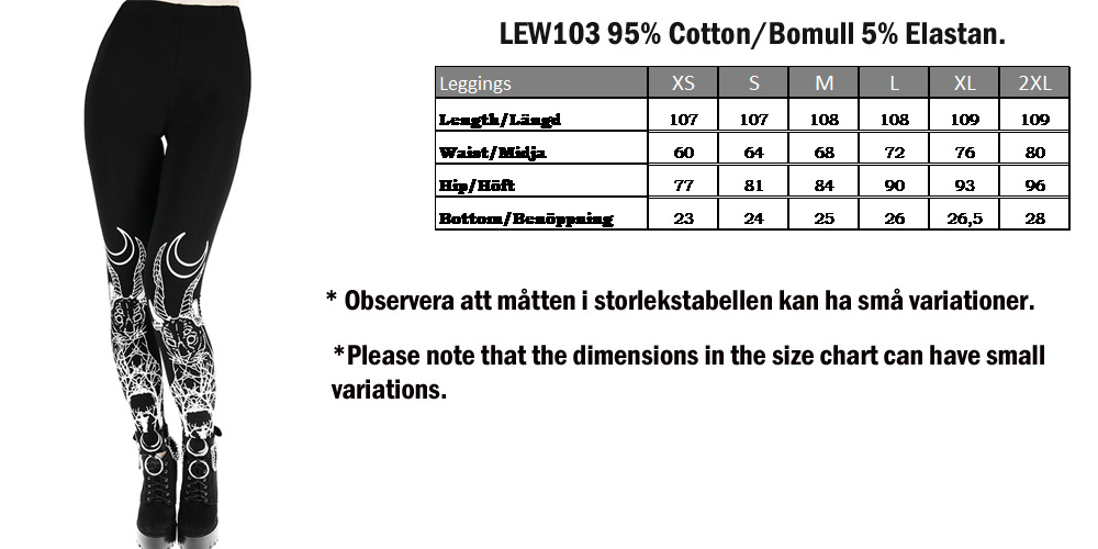 Leggingsene er høje i taljen med elastik. Hvis du kan lide at squatte, og har du mange muskler i benene, anbefaler vi en størrelse større, end du normalt har på i almindeligt tøj.