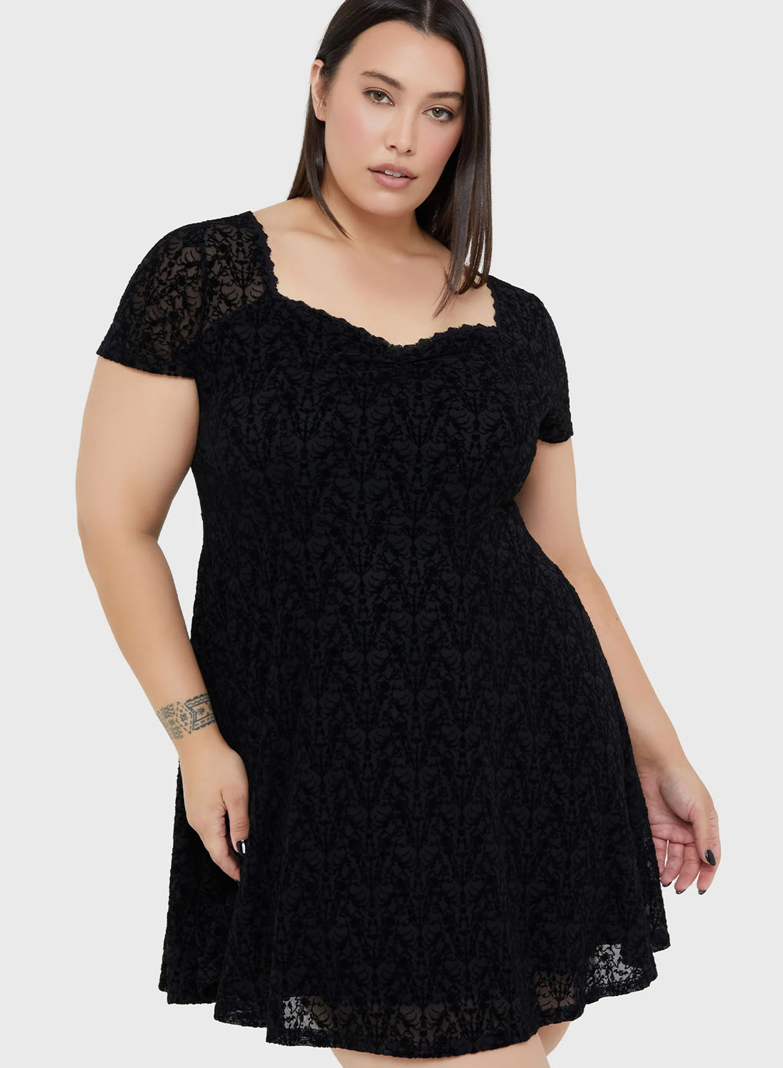Den figursyede overdel fremhæver taljen, mens den let udstrakte nederdel skaber en flatterende silhuet og et blødt fald. Den dekorative blonde sammen med den korte længde giver kjolen et feminint, men alligevel dramatisk look, der passer perfekt indenfor goth mode, alternativ mode og mørk romantisk stil.