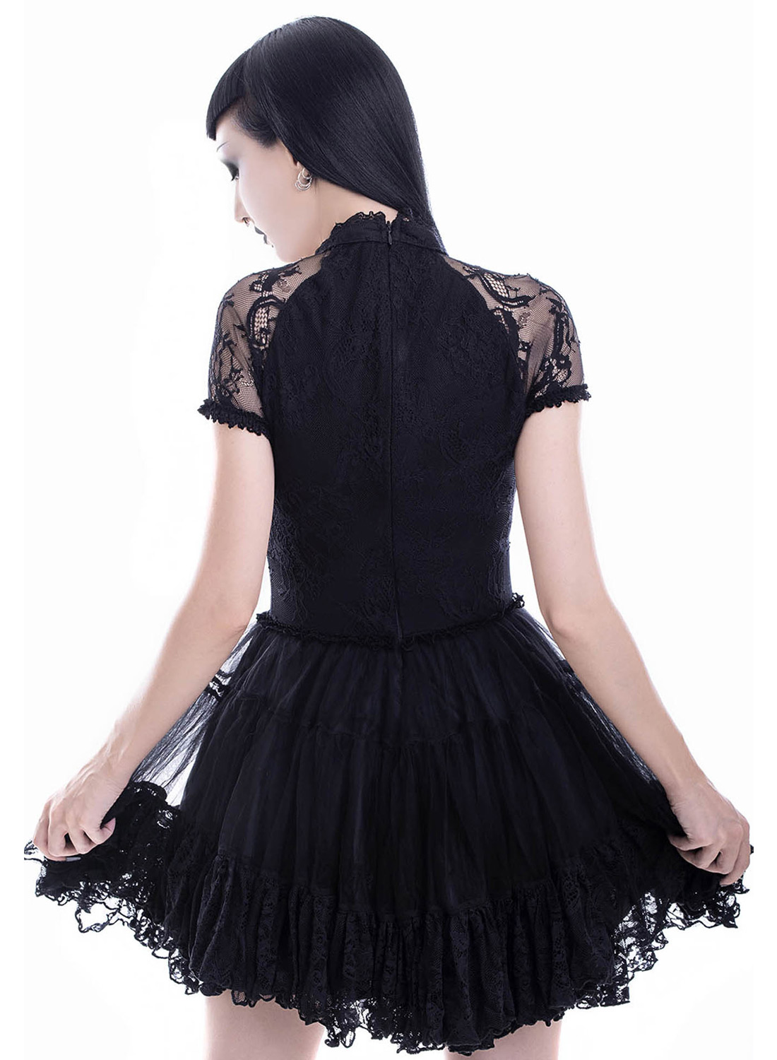 Den øverste del er lavet af dekorative blonder med en elegant choker krave hvilket giver kjolen et unikt gotisk præg. De korte blondeærmer sammen med den figursyede pasform fremhæver overkroppen på en flatterende måde. Den udstrakte nederdel er lavet af lag af blødt stof og blondekant, der giver kjolen et romantisk fald og legende bevægelser.
