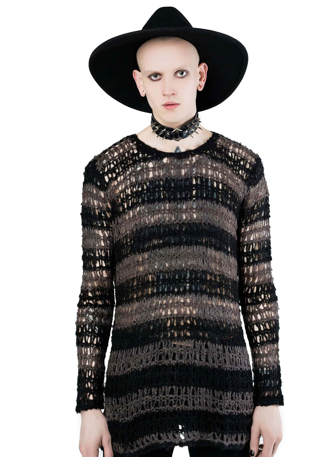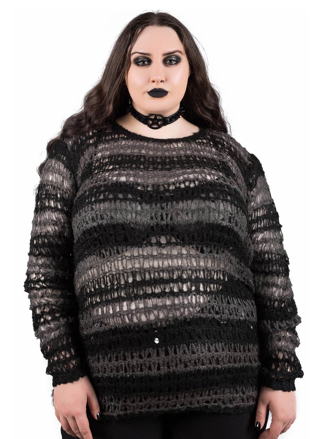 Strange daze Faux-Mohair sweater fra Killstar. 90'er grunge-inspireret blød striktrøje, perfekt til hverdage. Sved og gråstribet sweater med ekstra lang længde så den nemt kan dresses op eller ned. Med distressed detaljer og lav halsudskæring. Perfekt til festivaler, midnatsmånevandringer og tømmermændssøndage.