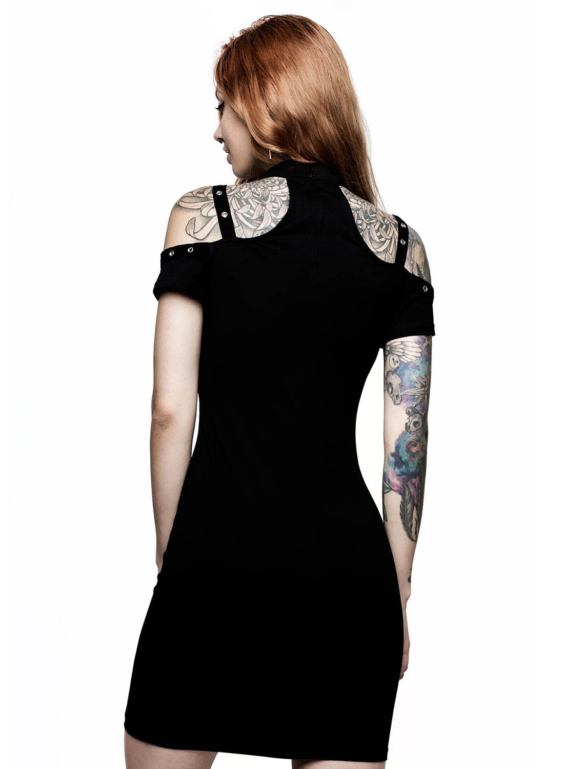 Killstar Lust For Death kjole. Blødt stretchstof med bardot-udskæring, choker og accentbånd med øjer - Rob Zombie-print foran. Skjult lynlås bagpå for nem af- og påtagning.