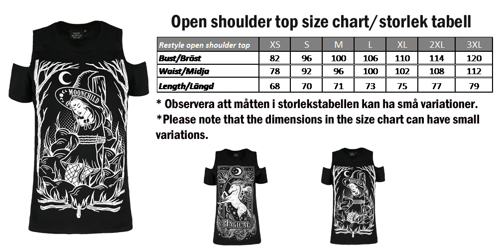 Magical Cold Shoulder Top er en stilfuld, gotisk åben skuldertop fra Restyle. Regular fit model med stort okkult print på brystet.