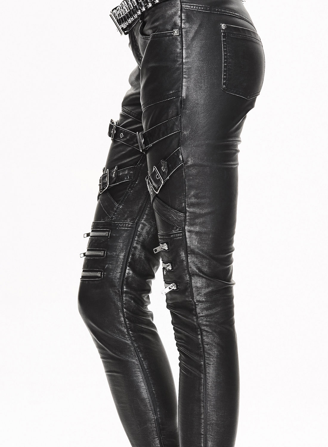 Syntetisk læder i antracitfarvet stenvasket look med nitte lommer, knap og lynlås. Stropper og lynlåse på benene.