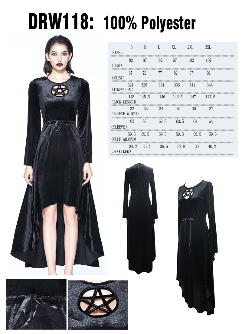 Morticia,  kjole fra Restless 'N' Wild. En fantastisk smuk kjole lavet af stretchy fløjl med pentagram dekoration foran. Silkebånd i taljen for en bedre pasform.